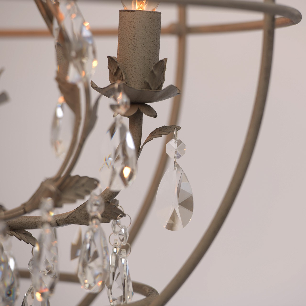 Основание выполнено из сплава металла и окрашено в серый цвет по технологии порошкового окрашивания. По технологии хай-лайт нанесены штрихи черного цвета. Потолочная чаша, корпус, декоративные элементы, декоративные розетки - прессование. Декоративный каркас, рожки - прокат на роликовом станке. Декор - прозрачный хрусталь миндалевидной формы и формы октагон.